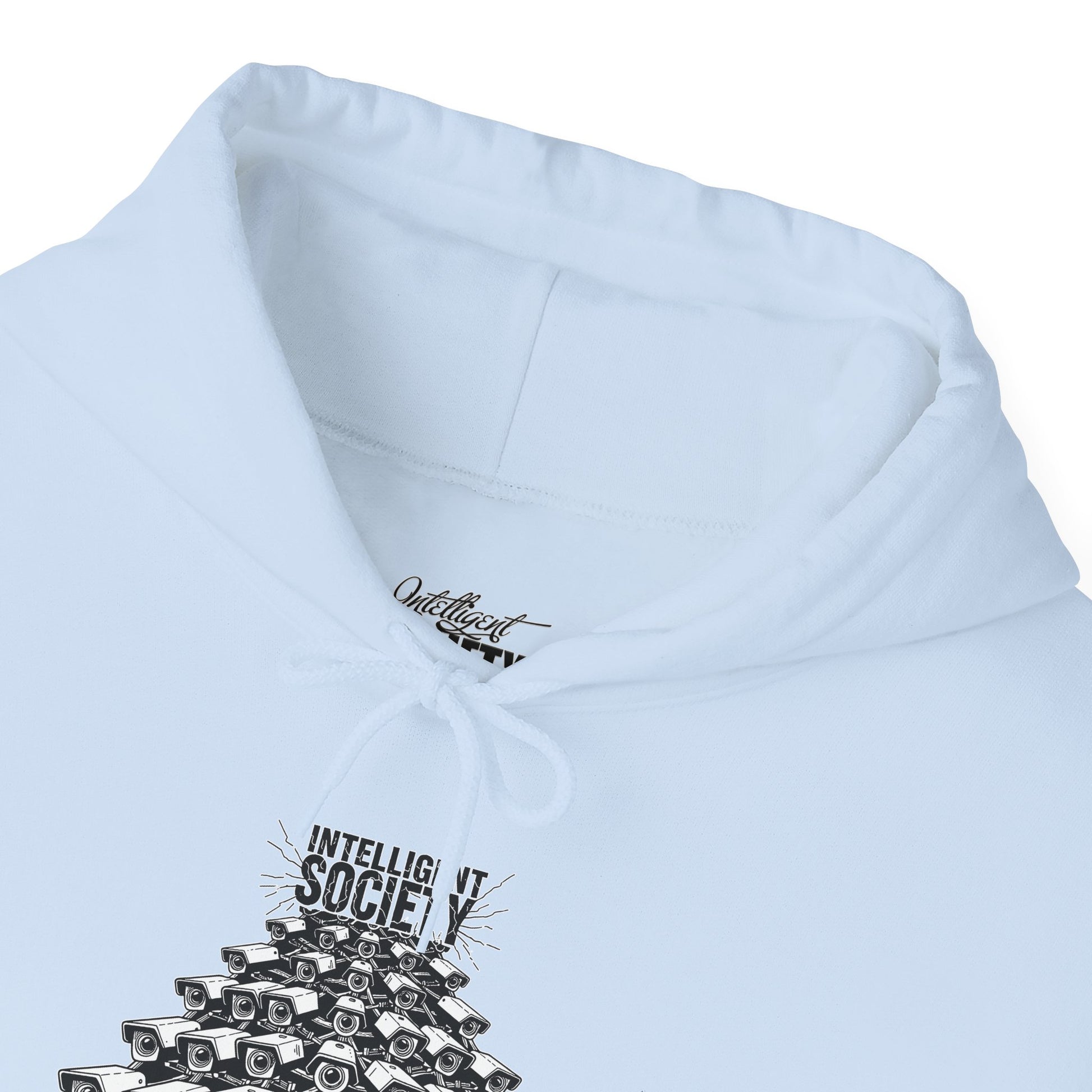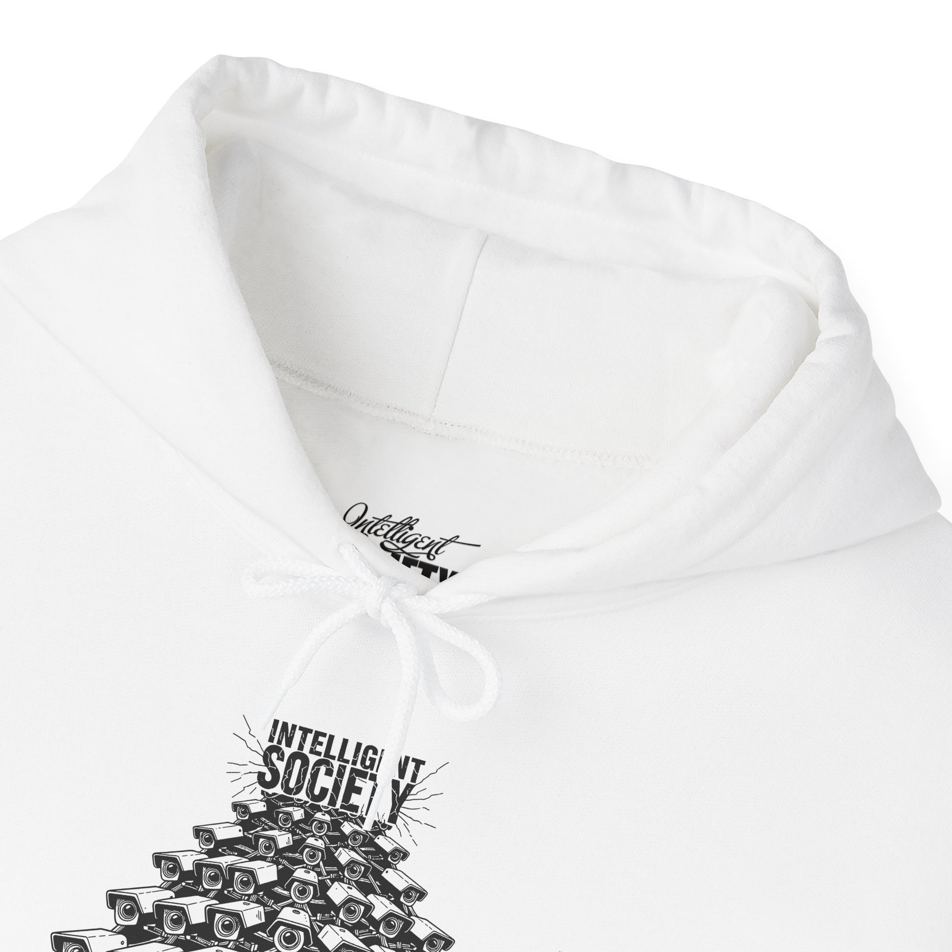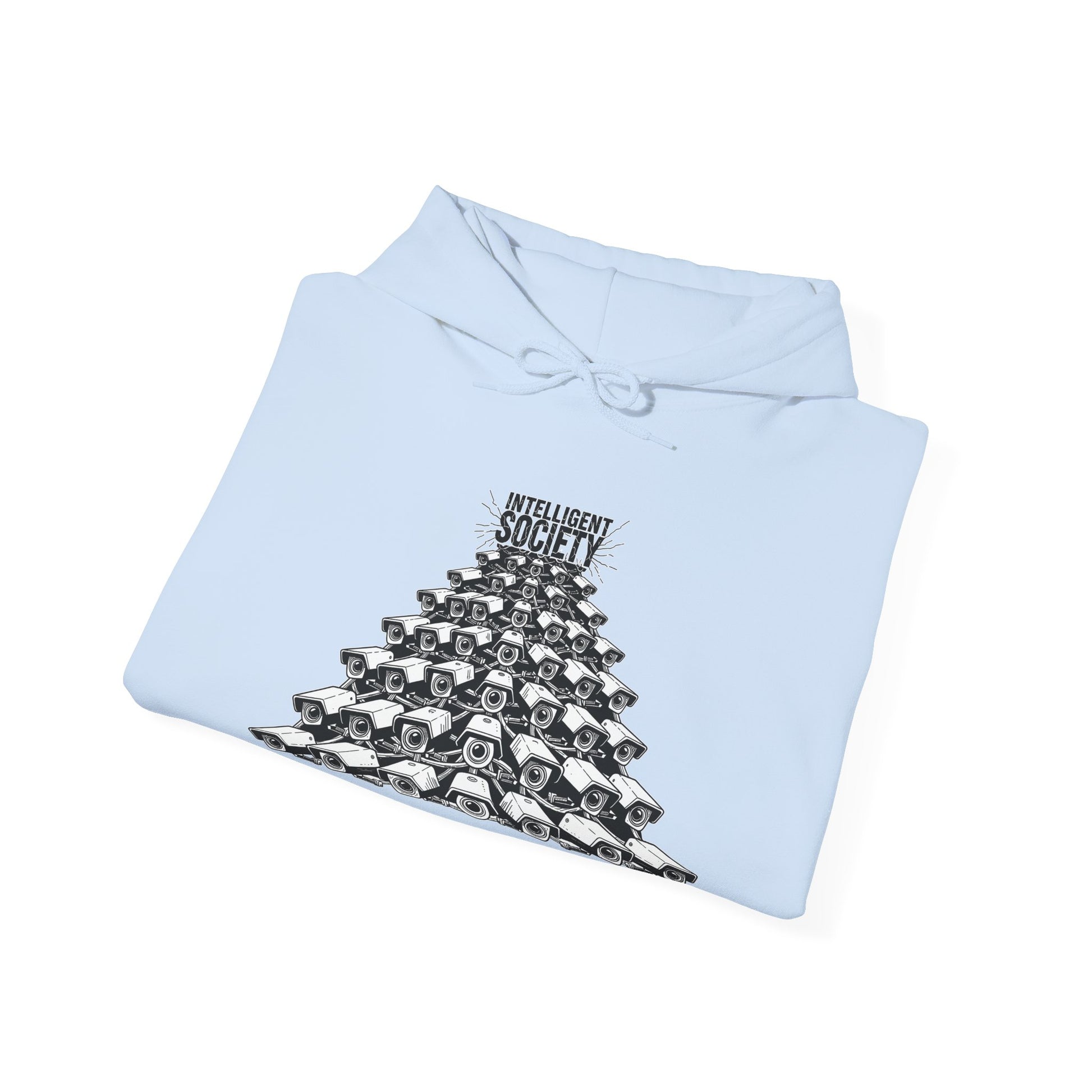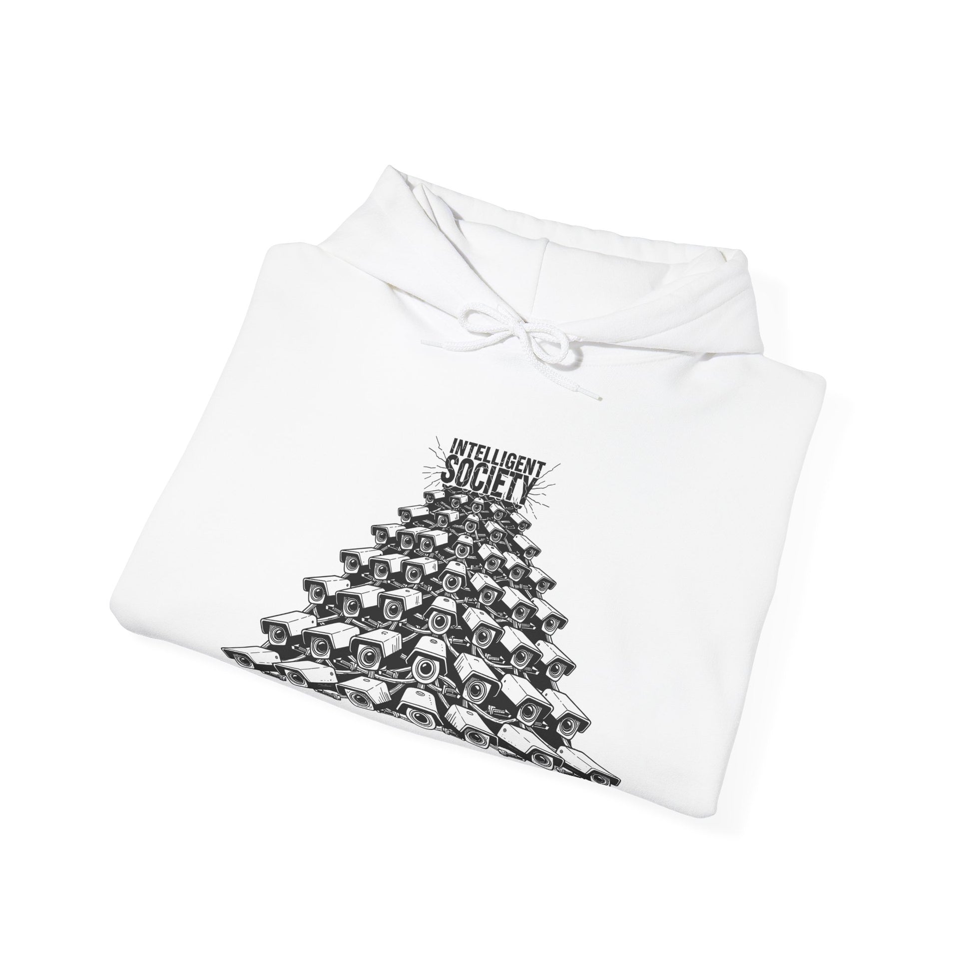 A bold Intelligent Society design featuring a pyramid of surveillance cameras, all converging upward toward the words “Intelligent Society.” This artwork symbolizes modern-day overreach, mass observation, and the growing tension between control and freedom. Clean monochrome linework and striking composition make this shirt a strong statement piece for those who value awareness, individuality, and truth.