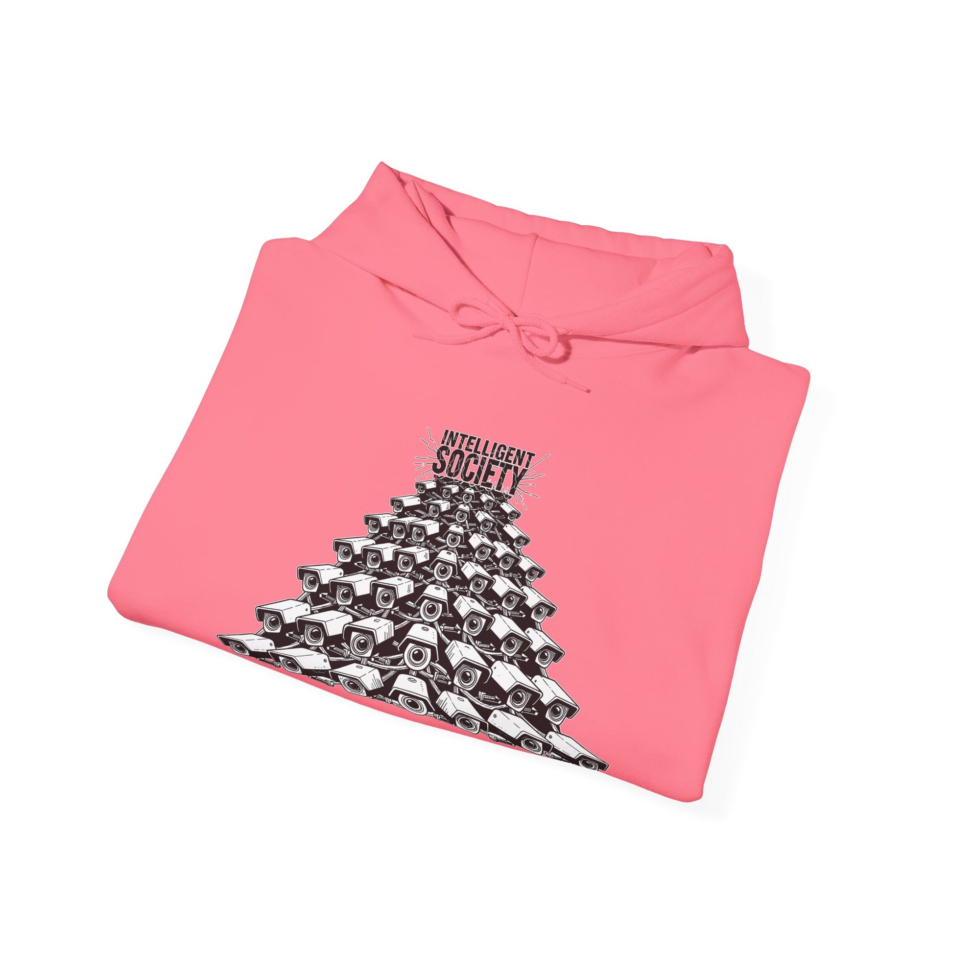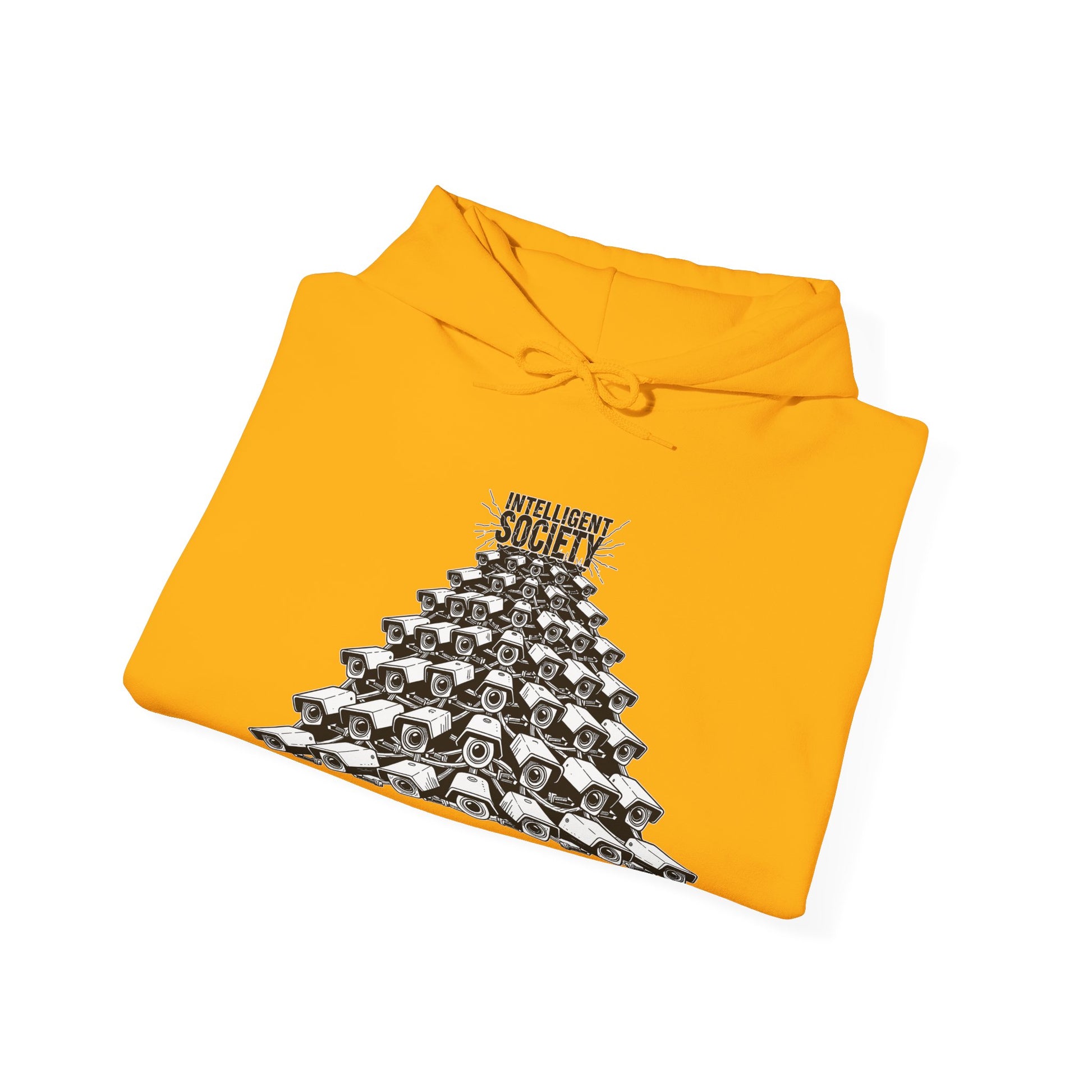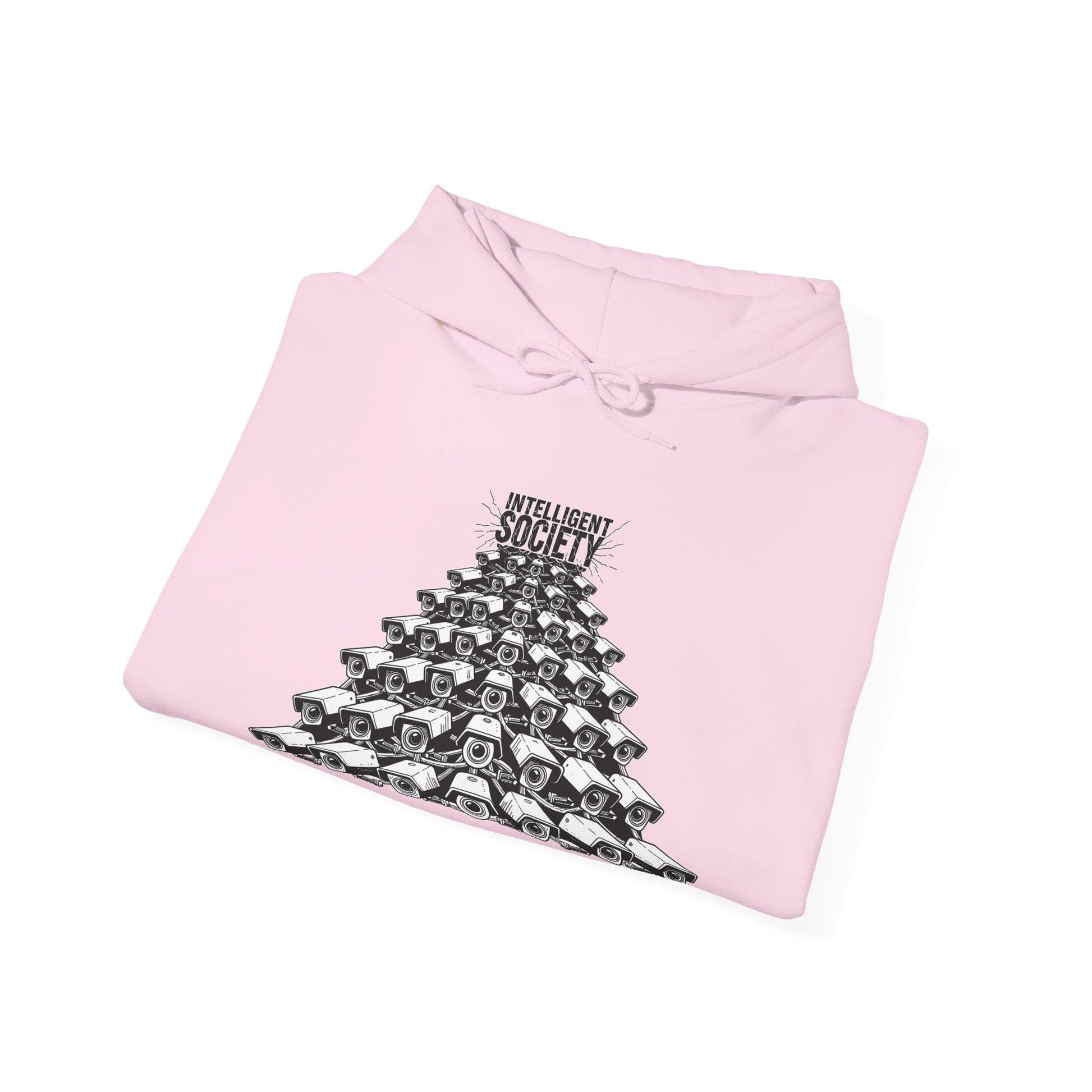 A bold Intelligent Society design featuring a pyramid of surveillance cameras, all converging upward toward the words “Intelligent Society.” This artwork symbolizes modern-day overreach, mass observation, and the growing tension between control and freedom. Clean monochrome linework and striking composition make this shirt a strong statement piece for those who value awareness, individuality, and truth.