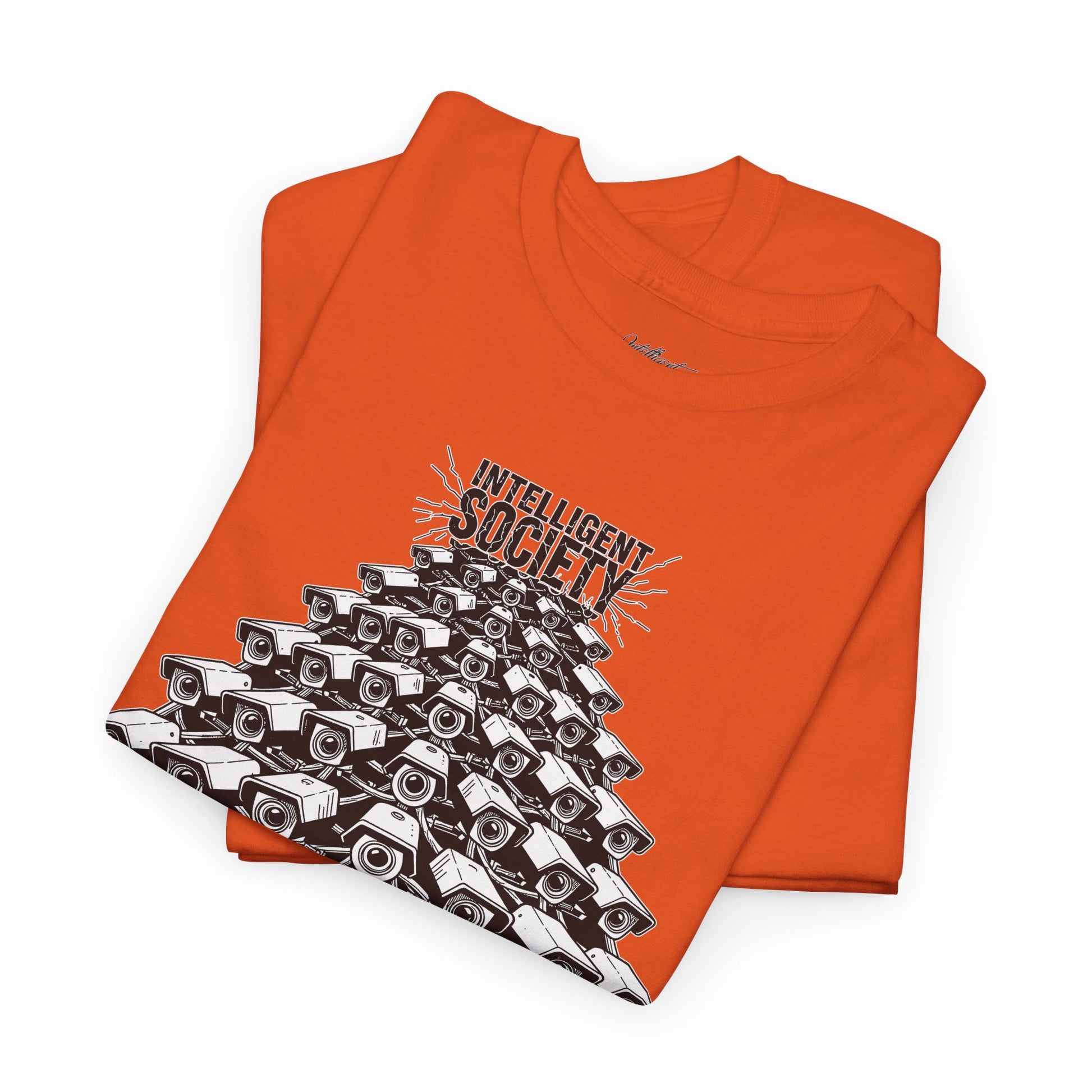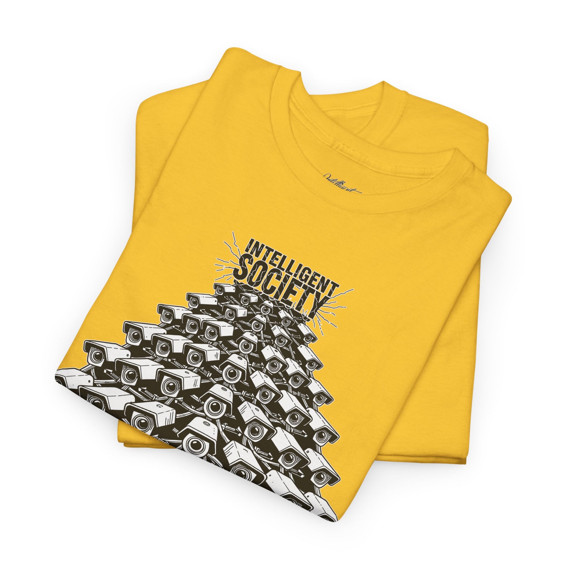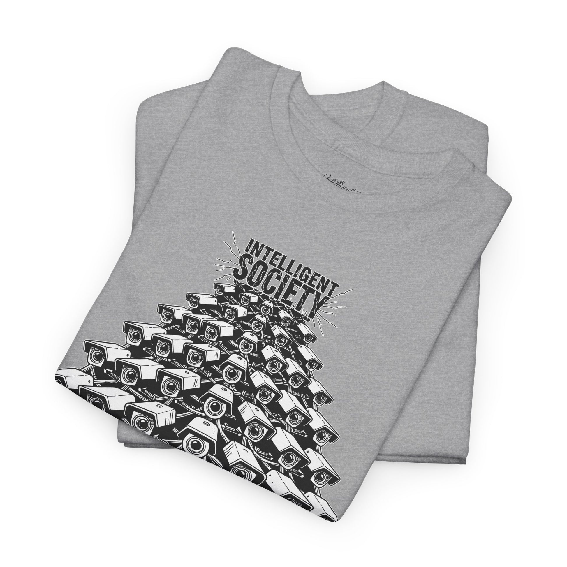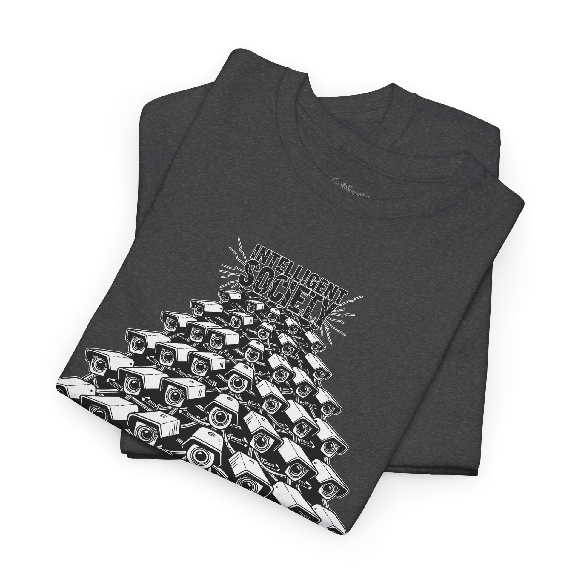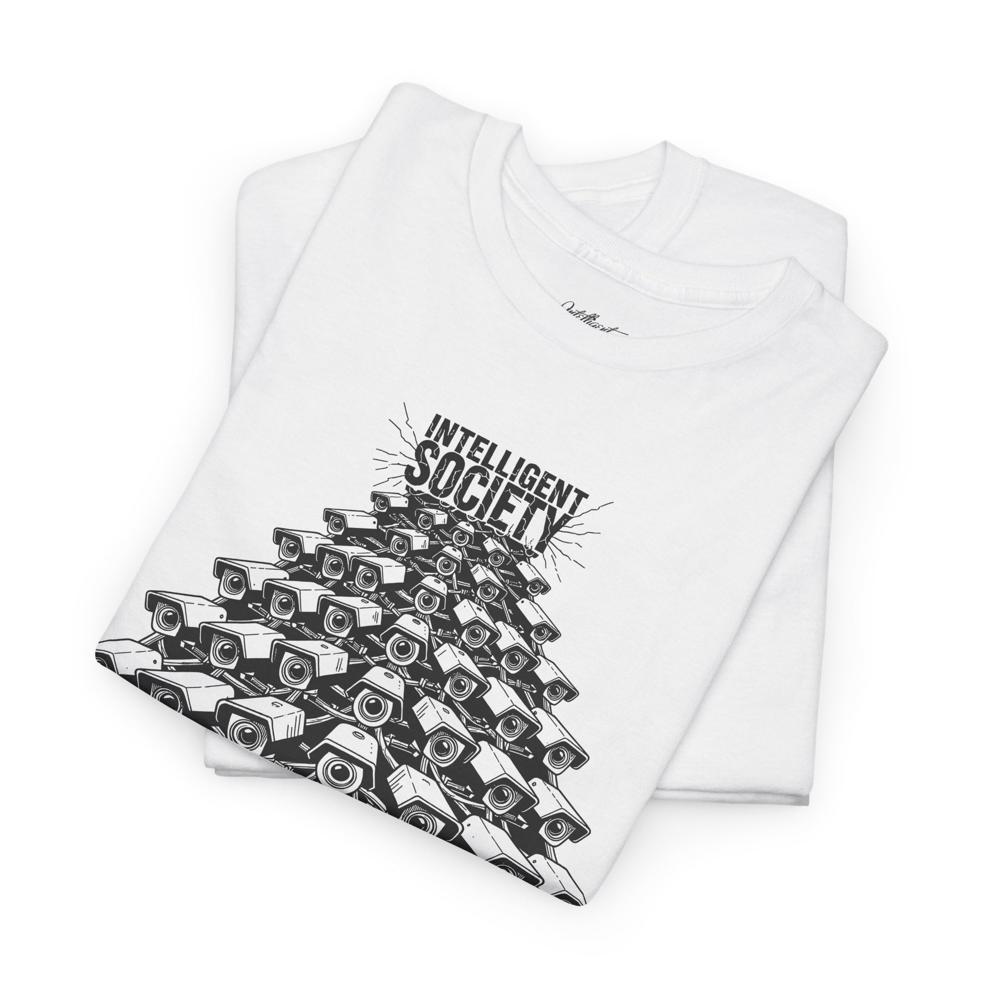 A bold Intelligent Society design featuring a pyramid of surveillance cameras, all converging upward toward the words “Intelligent Society.” This artwork symbolizes modern-day overreach, mass observation, and the growing tension between control and freedom. Clean monochrome linework and striking composition make this shirt a strong statement piece for those who value awareness, individuality, and truth.