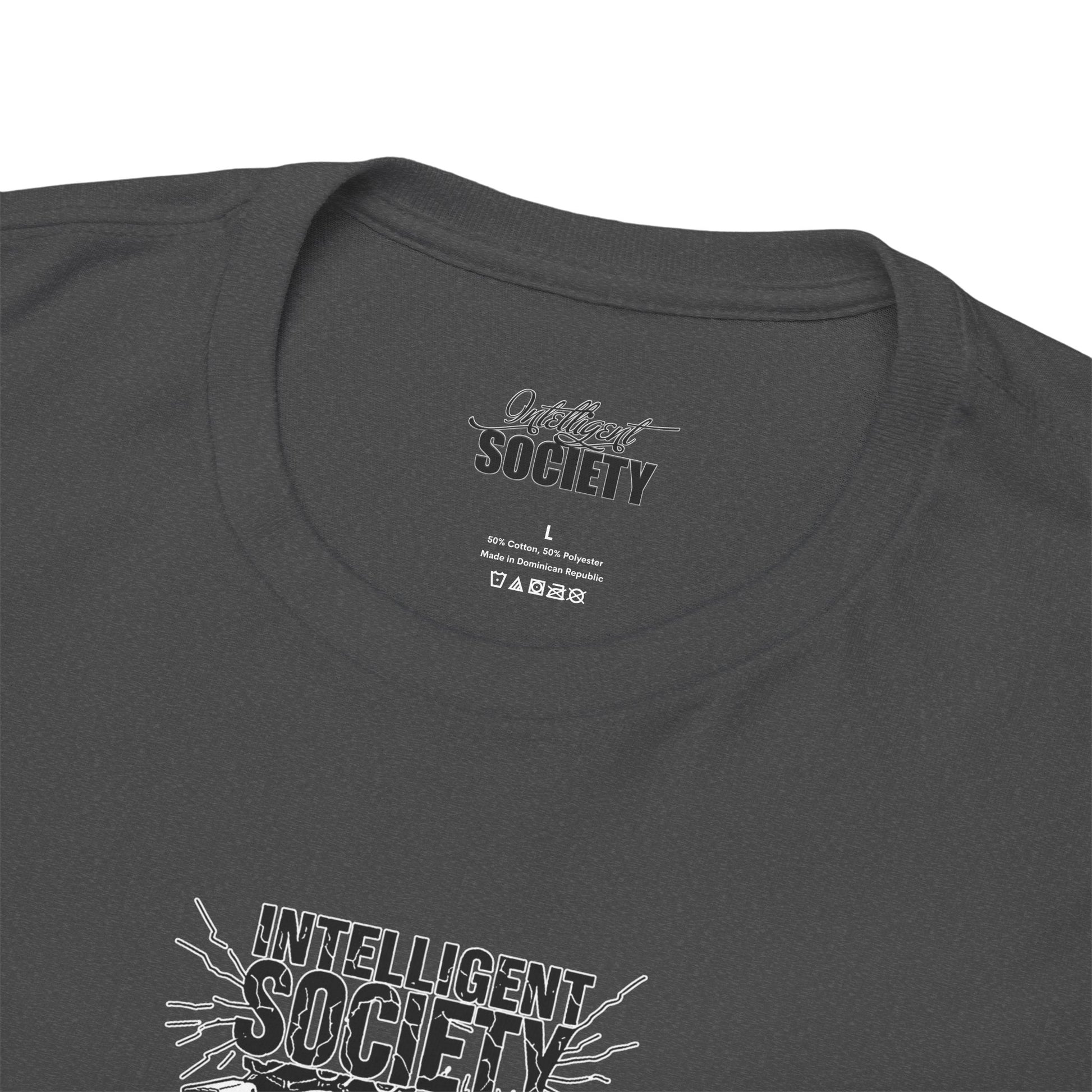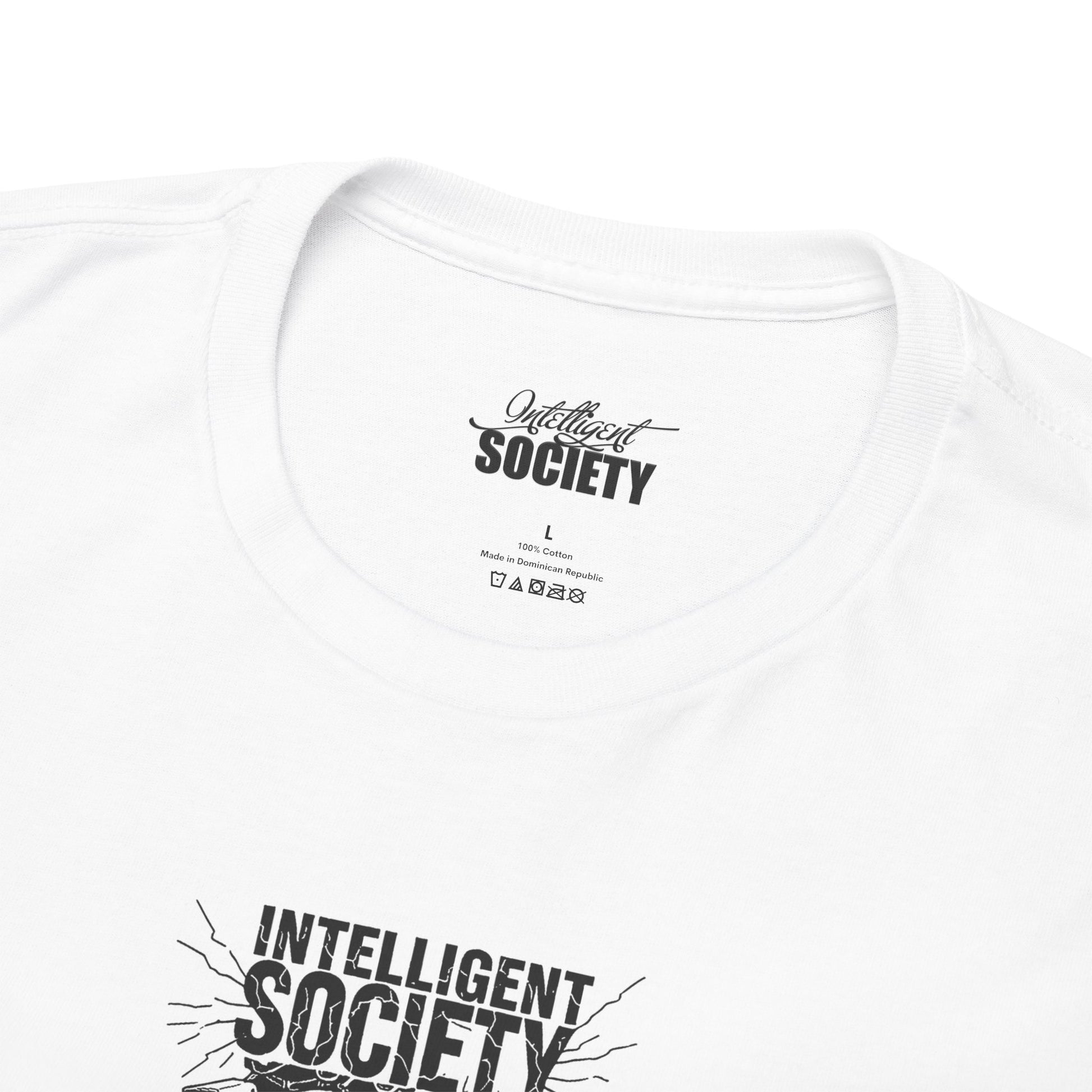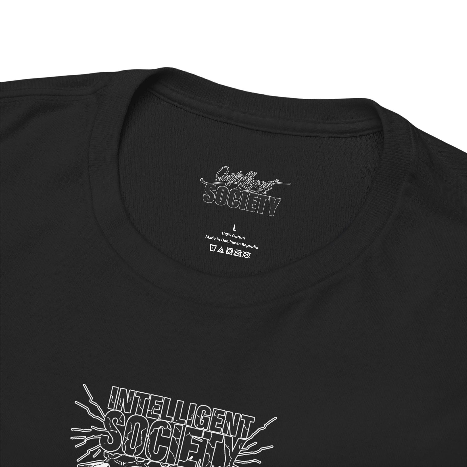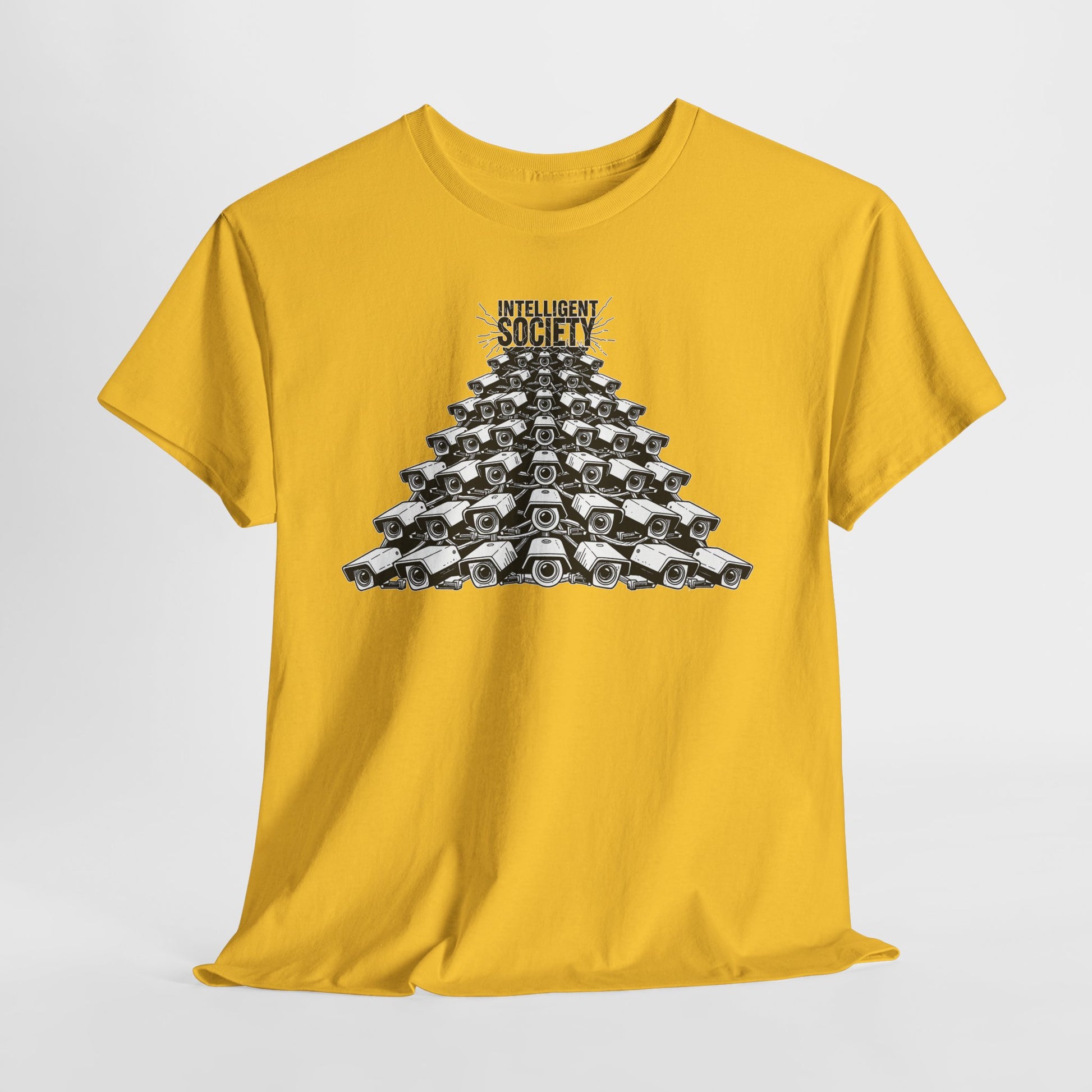 A bold Intelligent Society design featuring a pyramid of surveillance cameras, all converging upward toward the words “Intelligent Society.” This artwork symbolizes modern-day overreach, mass observation, and the growing tension between control and freedom. Clean monochrome linework and striking composition make this shirt a strong statement piece for those who value awareness, individuality, and truth.